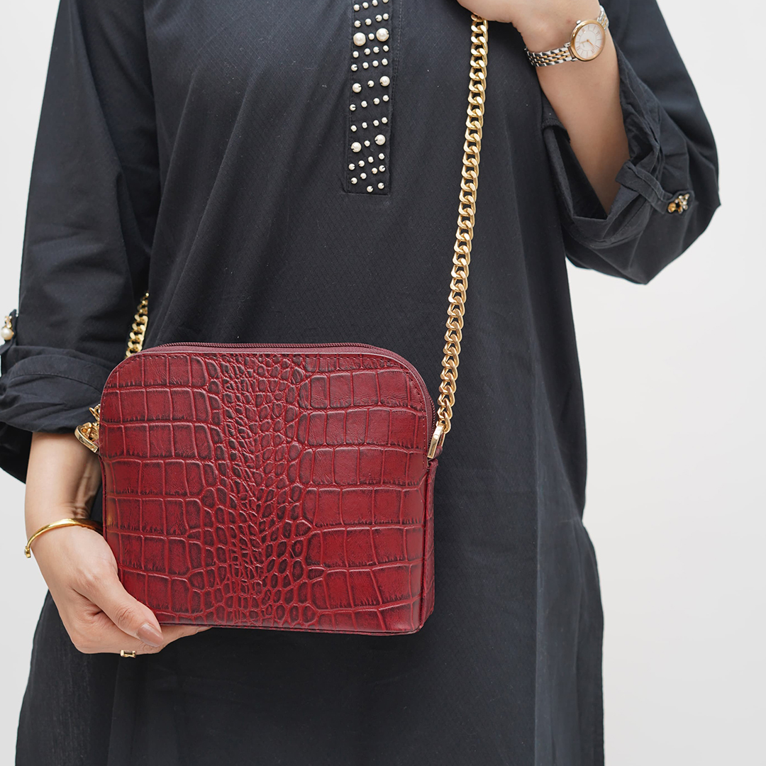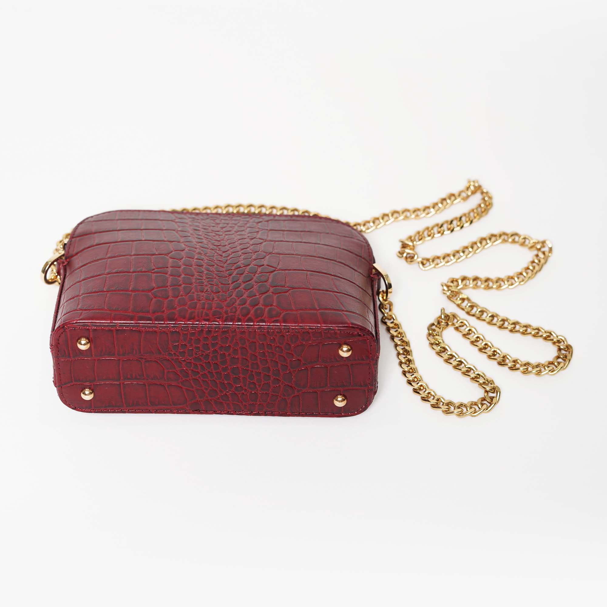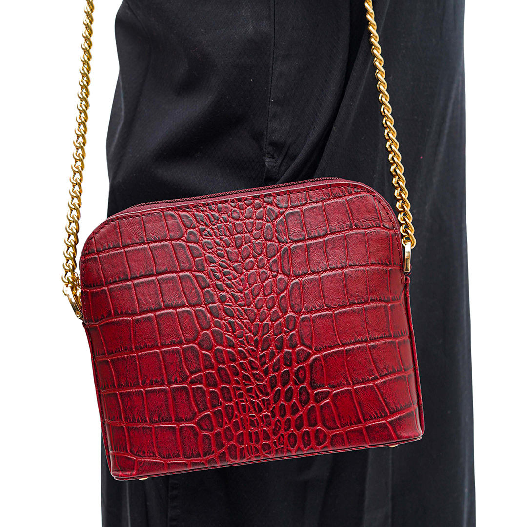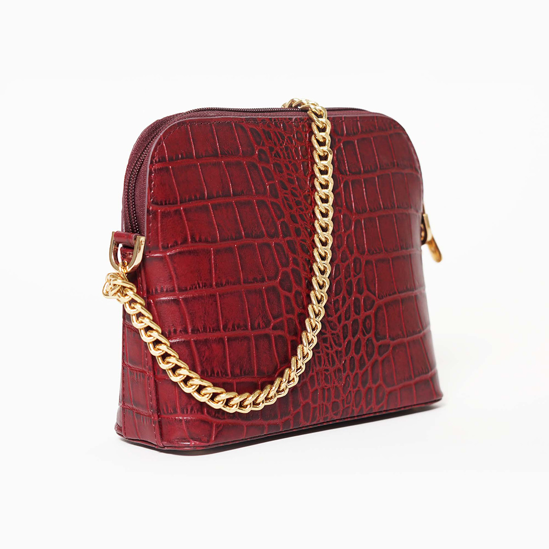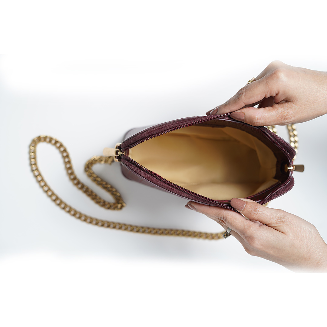 The Audrey bag is the epitome of understated luxury. Crafted from exquisite croc-textured leather, it makes the perfect statement piece for stylish brunches, elegant luncheons, and glamourous soirées. Its structured silhouette, complemented by a sleek gold chain strap, exudes sophistication. The bag is available in two timeless colours—maroon for a rich, bold aesthetic and ecru for a soft, refined touch.