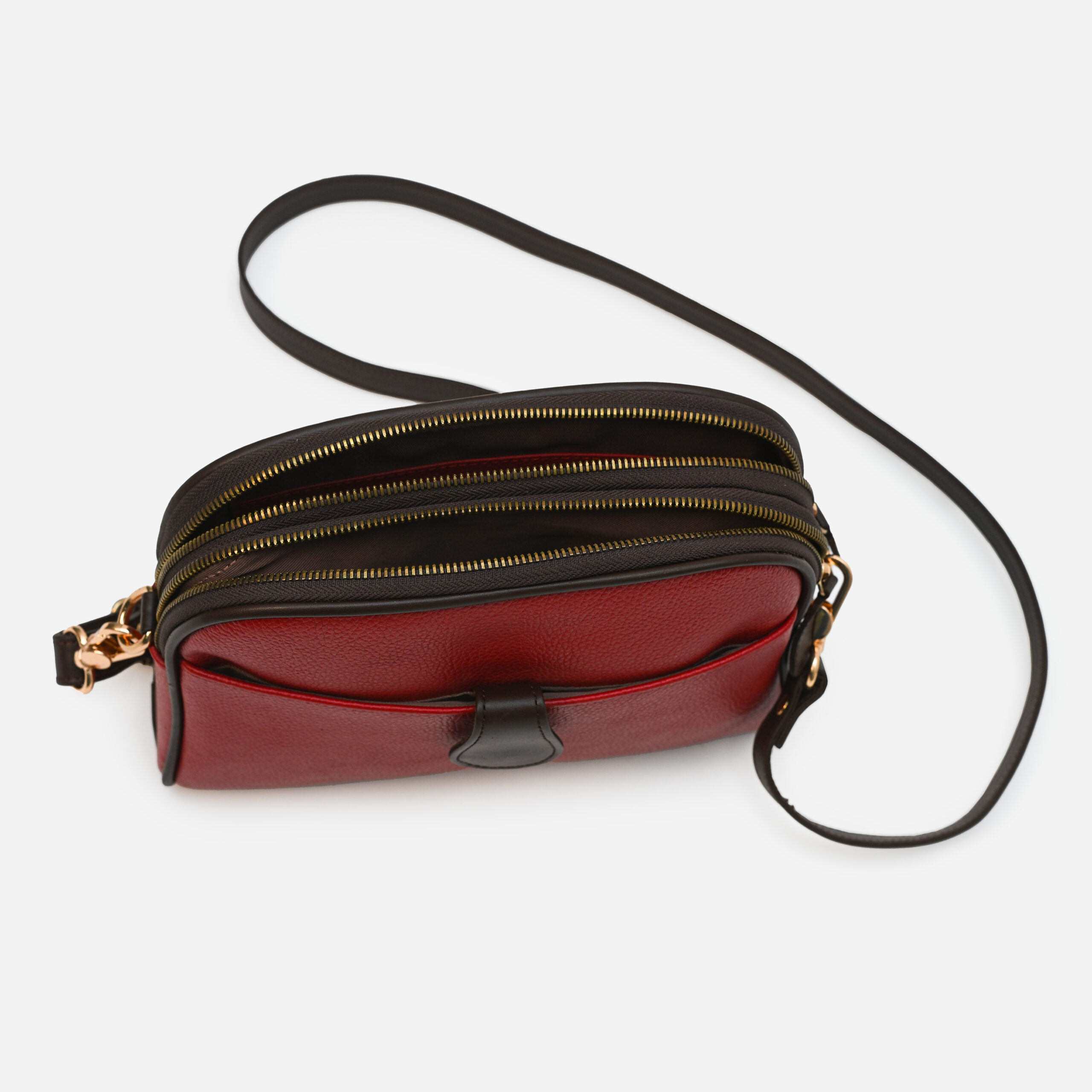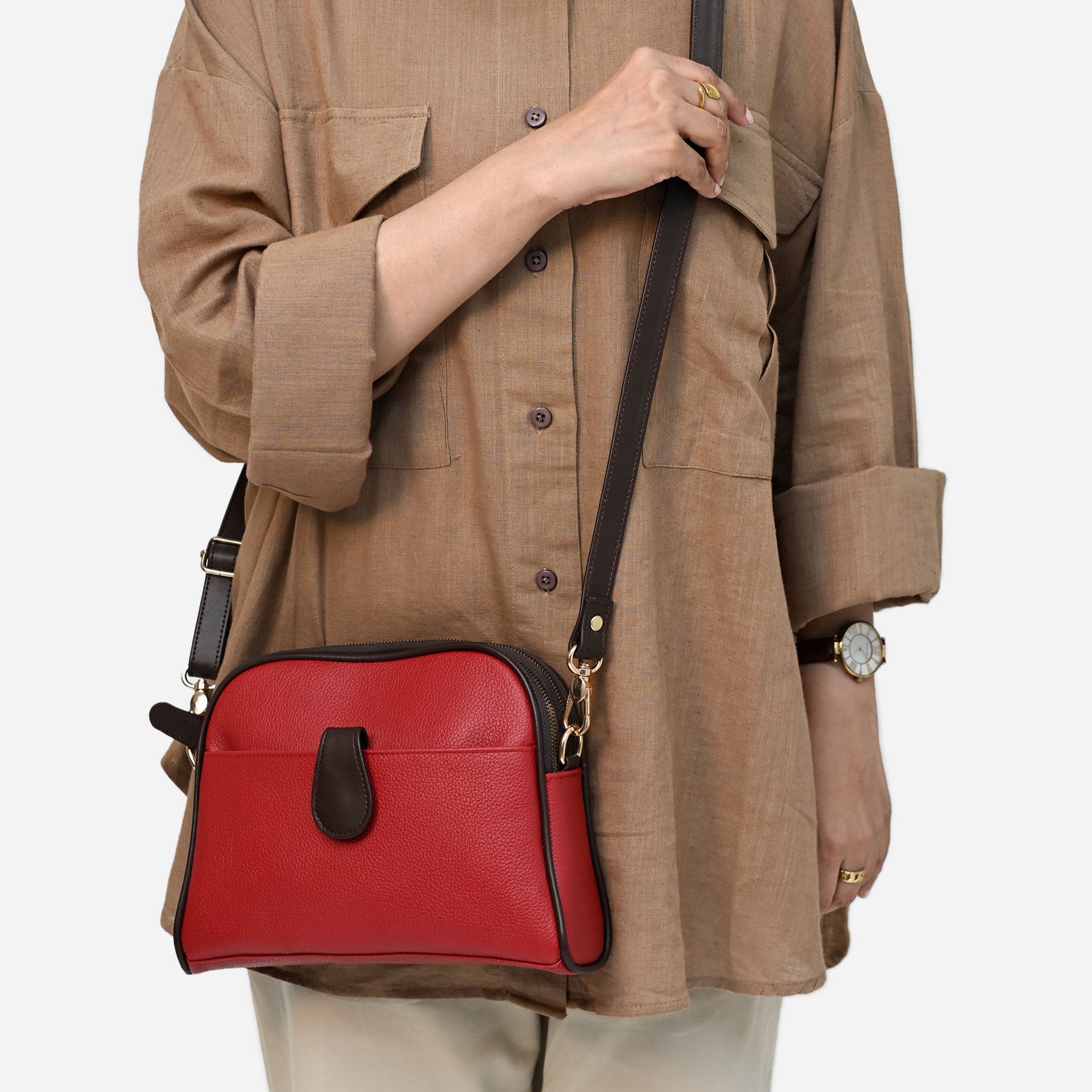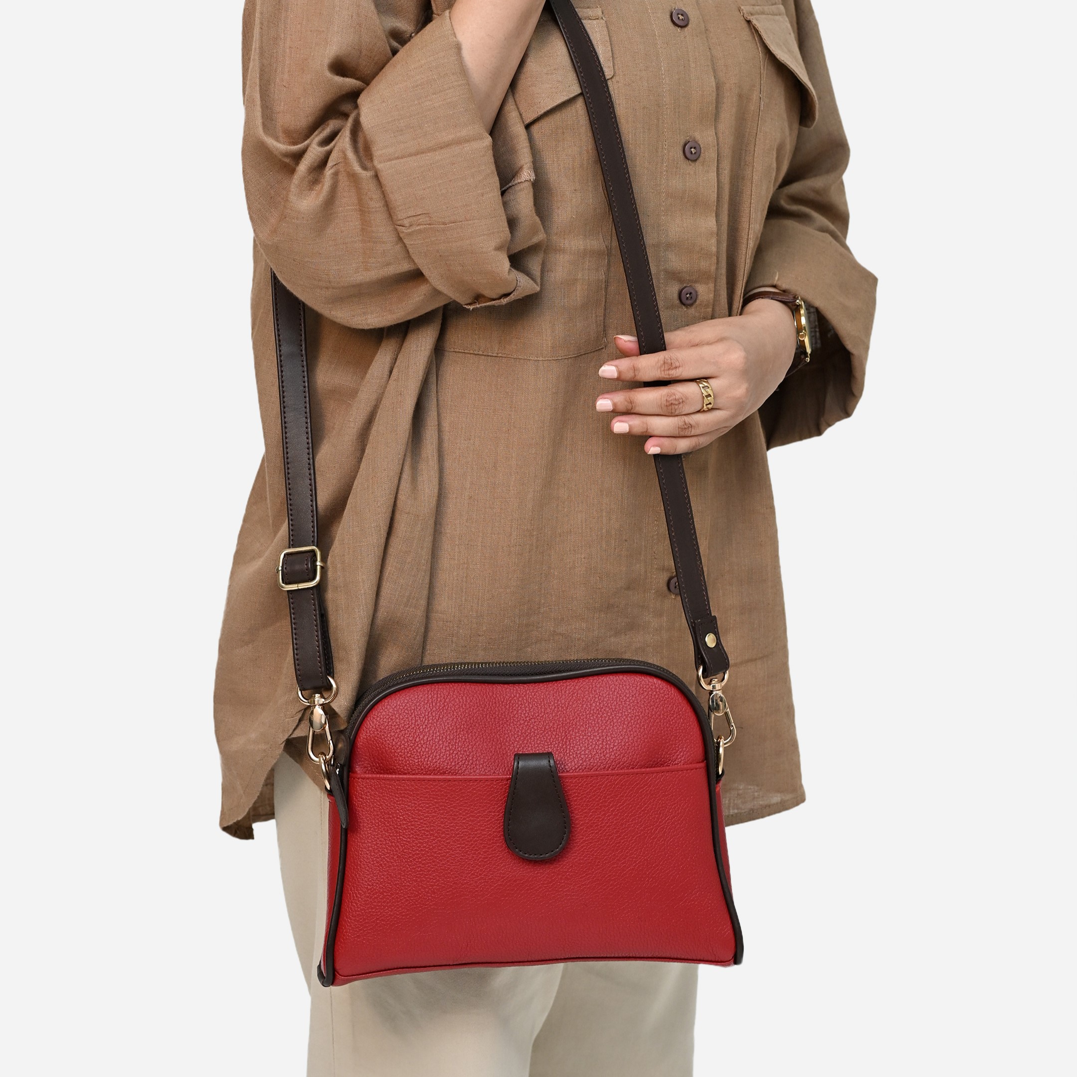 Designed for the urban woman who navigates city life with confidence, the Bergen crossbody bag beautifully balances form and function. Its two-tone palette and curvilinear silhouette lend it a metropolitan flair, while the compact yet roomy interior provides ample space for keeping daily essentials organized. Crafted from a mix of smooth and pebble-grain leather, Bergen transitions seamlessly between work, errands, and coffee runs. Available in midnight blue & tan and vermilion & brown combinations.